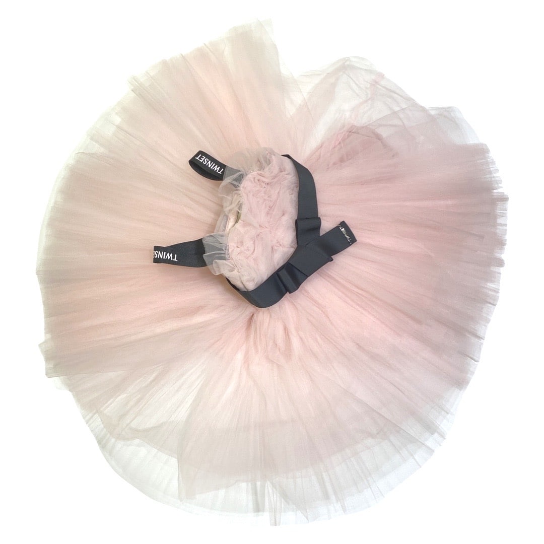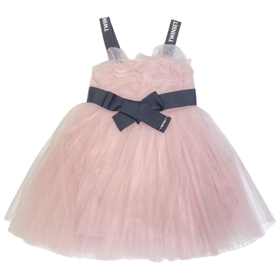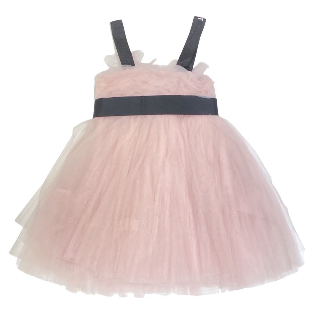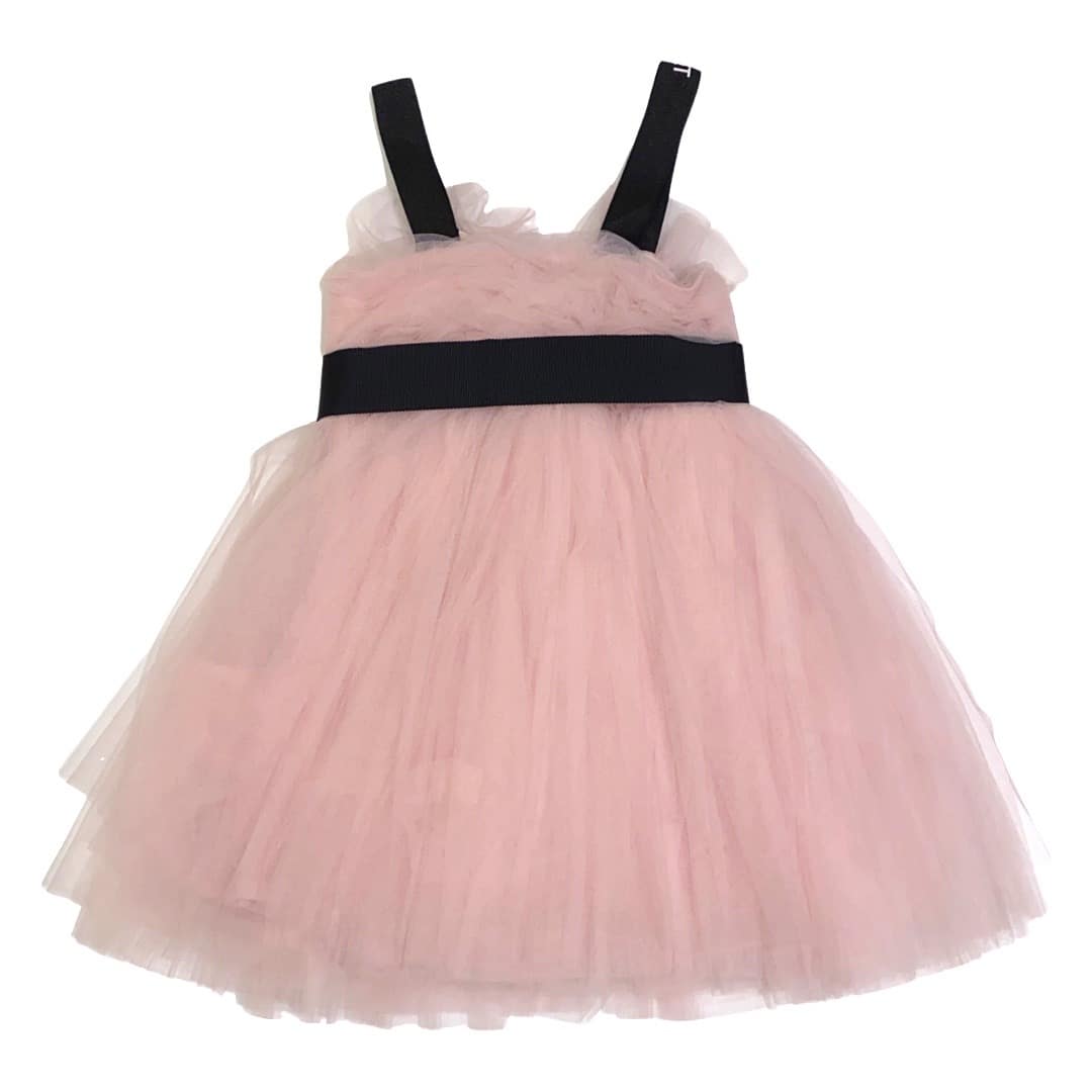 fodera 100%cotone-abito in tulle-chiusura con zip a scomparsa laterale-cintura removibile-bretelle nere con scritta logo rosa